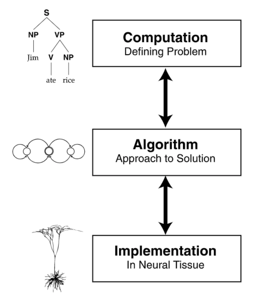 要探索大腦與人工智能的奧秘,在「運算目標層次(copmutation)」首先要先定義問題,我們想要研究大腦的什麼功能?這個功能可以協助個體解決什麼問題?這個問題對個體為什麼重要?其次,在「表徵與演算層次(representation & algorithm)」嘗試提出能夠達成運算目標的步驟,及其需要的資訊,這樣的步驟可能不只一種,所需要的資訊表徵也各不相同。最後,要能比較並且選擇出最合適的演算法,則需要在「硬體執行層次(implementation)」考慮大腦內如何使用既有的細胞分子機制,達到上述的演算資訊處理過程。